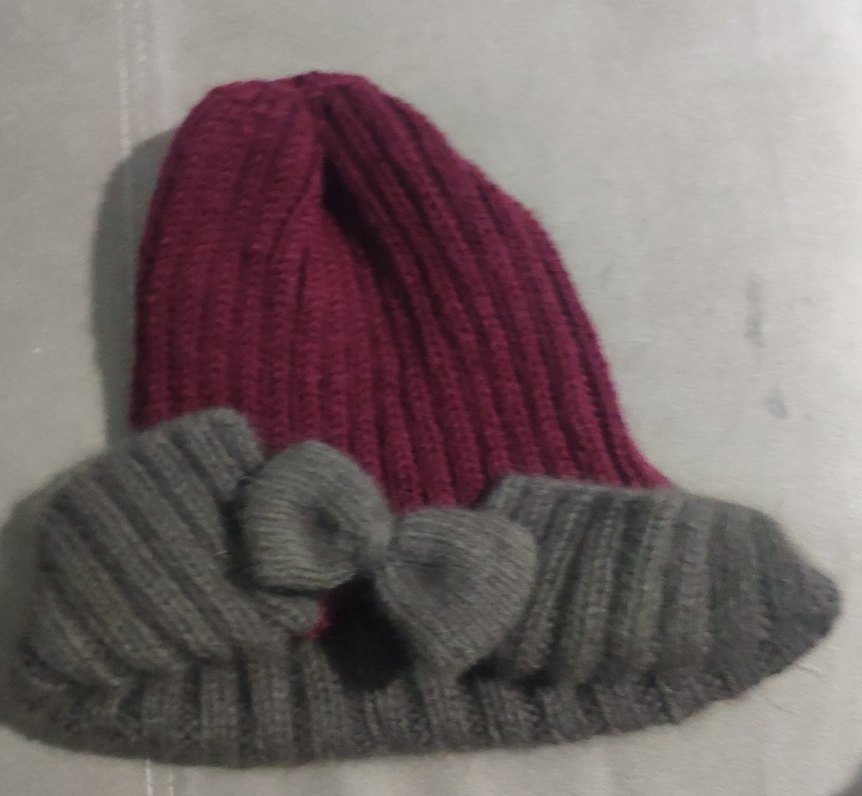 Çocuk örgü bere, gri katlanabilir kenar ve süslemeli fiyonklarla rahat ve sade bir tarz sunar.