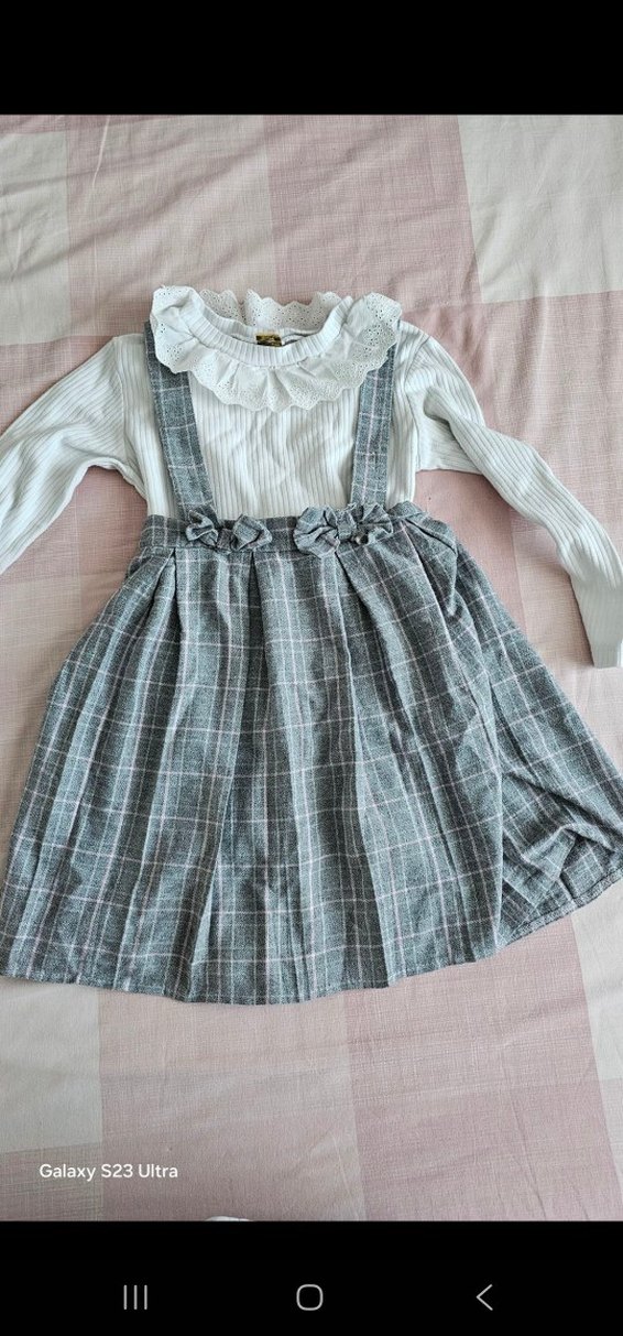 Gri örgü kumaştan yapılmış, bol kesim kız çocuk elbisesi. Askılı kollu ve fırfırlı yuvarlak yaka detaylı, ekoseli etek kısmı fiyonk süslemelidir.