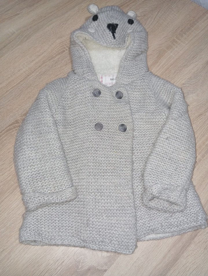 Gri renkli, örgü kumaştan yapılmış kız çocuk hırkasıdır. Kapüşonunda ayı kulakları ve çift düğmeli ön kapama bulunur. Rahat kesimlidir.
