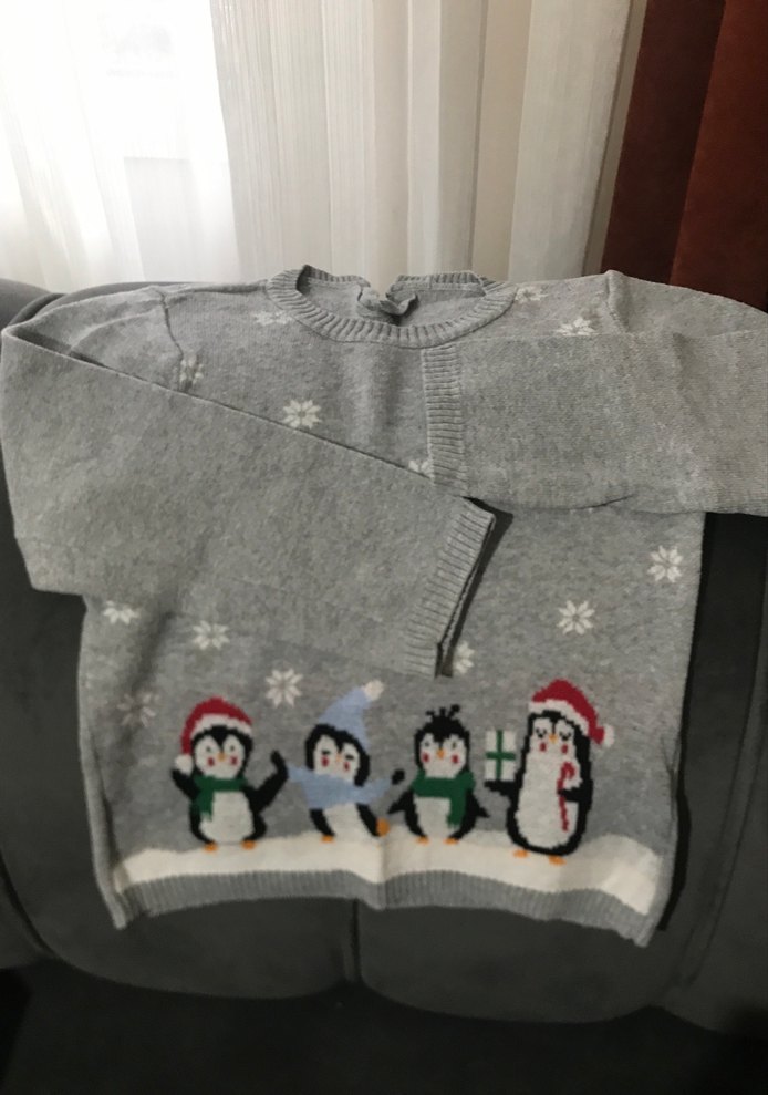 Fitted kesim gri örgü kazak, yuvarlak yaka ve uzun kolludur. Alt kısmında eğlenceli penguen desenleri bulunur. ❄️