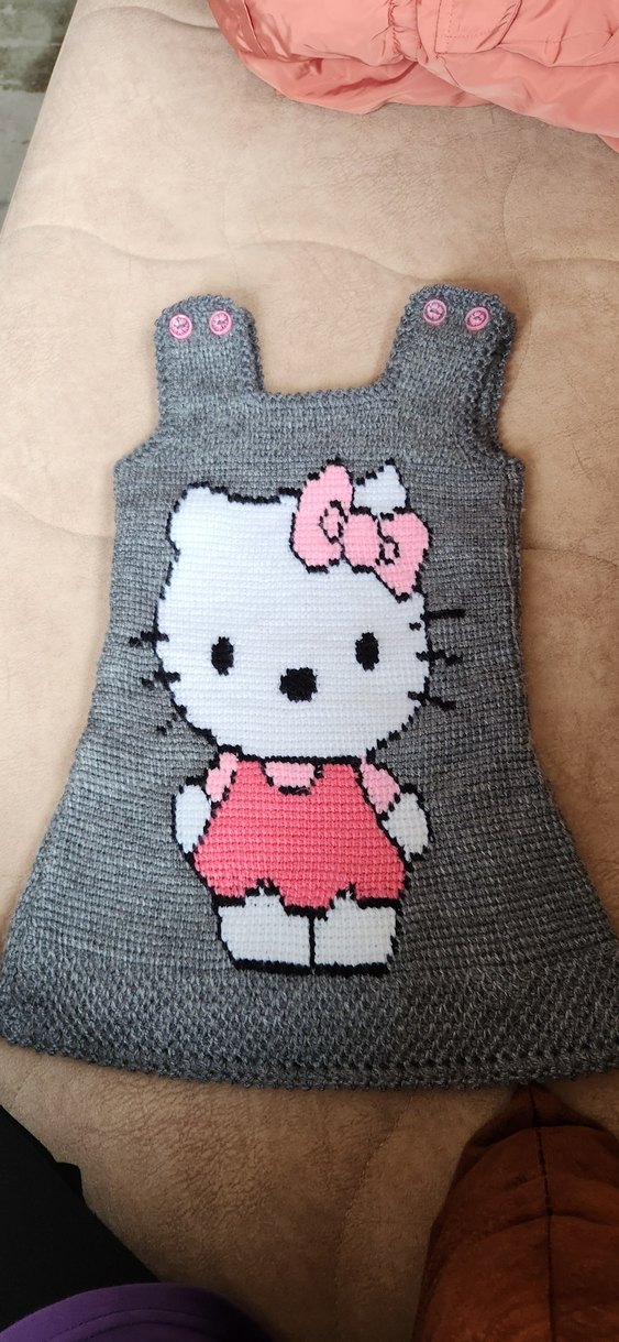 Gri renkli, düğmeli askılı, straplez yaka kız çocuk örgü kolsuz elbise, önünde işlemeli Hello Kitty deseni bulunur. kucuk geldi kullanilamadi el emegi orgu
