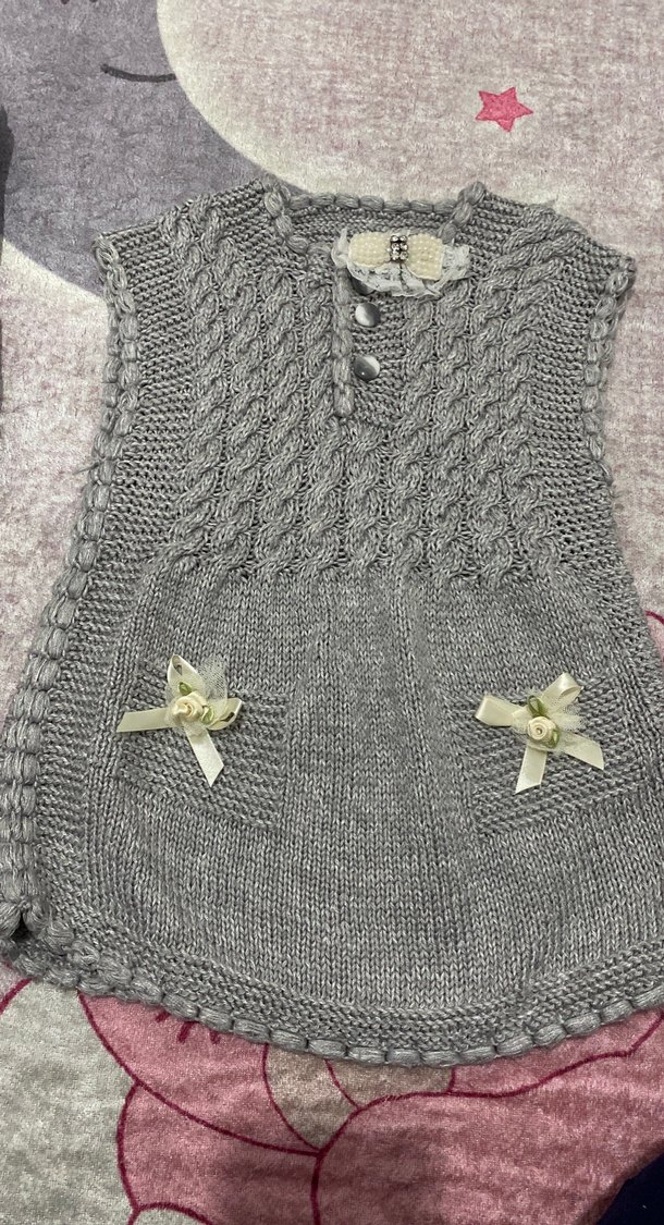 Gri renkli, örgü kumaştan yapılmış kız çocuk kolsuz yelek. Nakışlı desen, halter yaka ve bol kesim. Ön ceplerinde dekoratif fiyonklar bulunur.