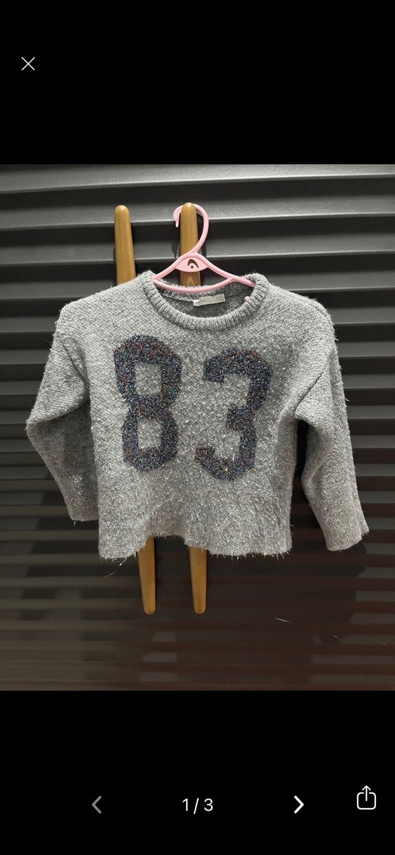 Gri renkli, uzun kollu, yuvarlak yakalı kız çocuk örgü kazak. Önünde 83 nakışlı desen bulunur, rahat ve bol kesimdir.