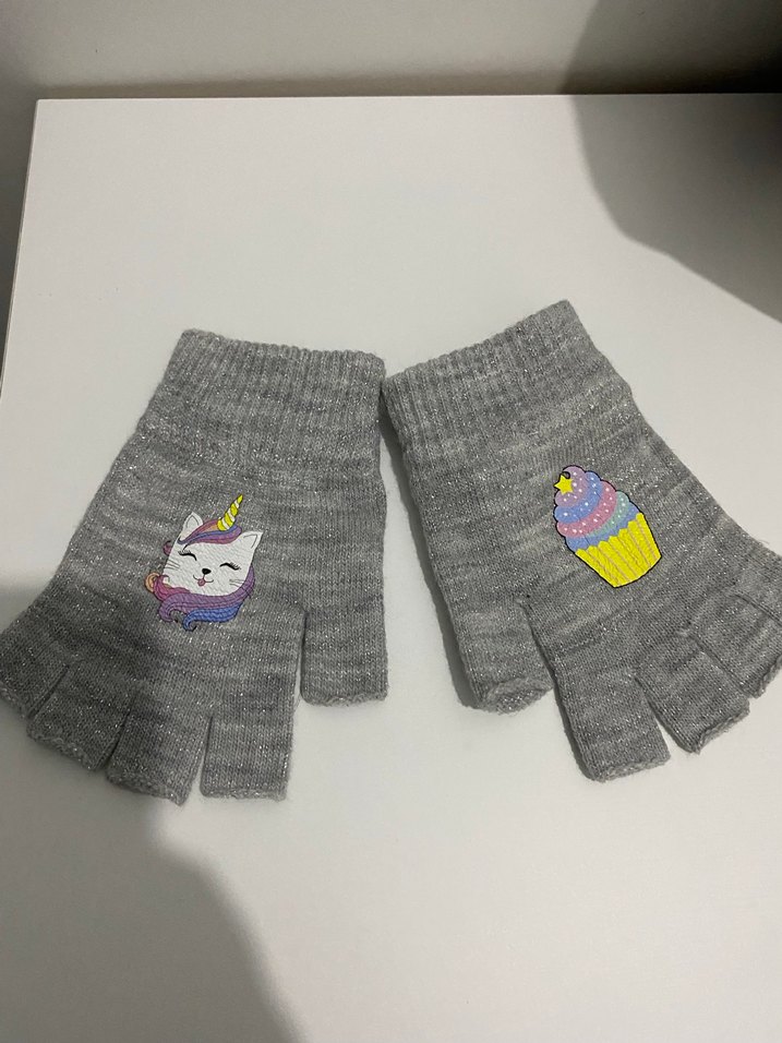 Kız çocukları için unicorn ve cupcake nakışlı, gri örgü parmakları açık eldivenler. Trendy sokak giyimi için uygundur.