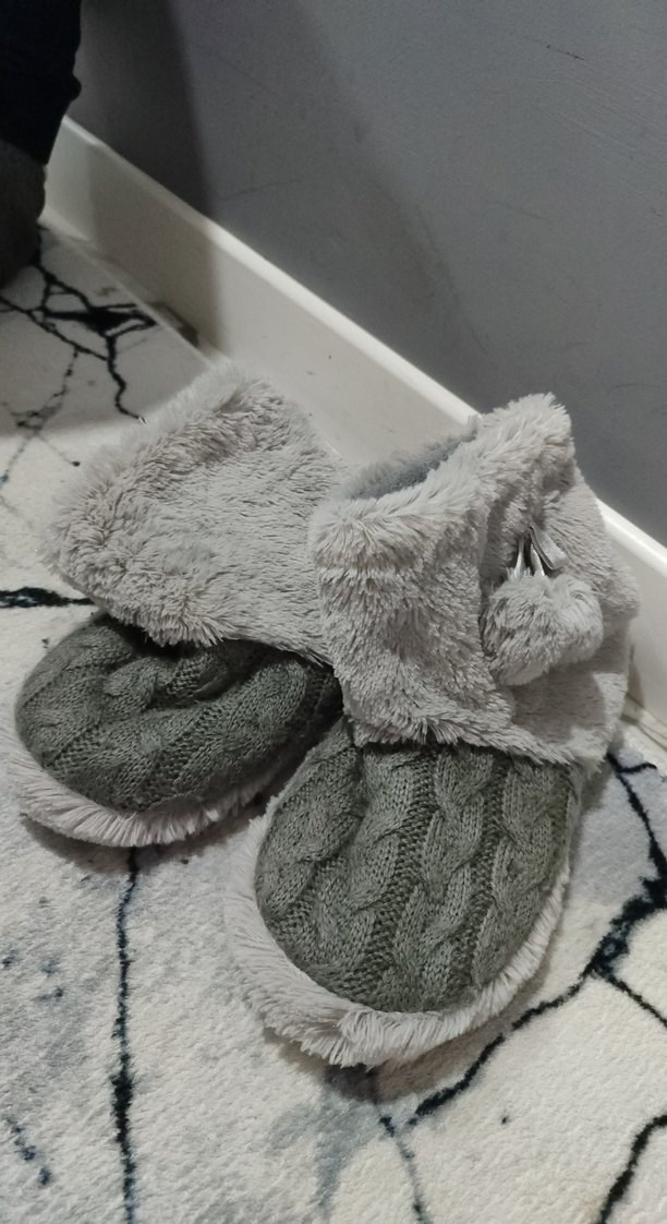 Kız çocukları için gri örgü desenli, yumuşak tüylü üst kısmı ve iç kısmı ile sıcak tutan ev terliği.