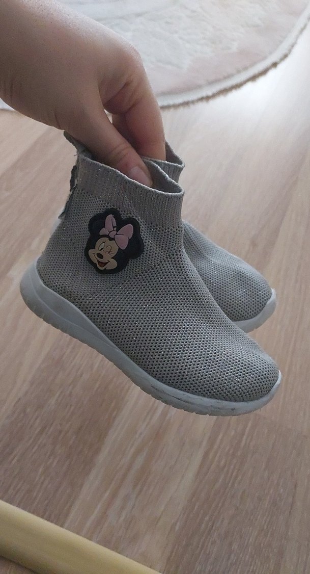 Gri örgü kız çocuk spor ayakkabılar, lastik tabanlı ve işlemeli Minnie Mouse detayına sahip, sokak stiline uygun.