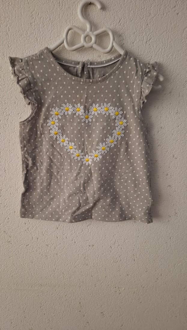Gri pamuk kumaştan, kısa kollu ve fırfırlı detaylı bol kesim tişört. Önü papatya desenli kalp baskılı, yuvarlak yaka. Size 86 cm