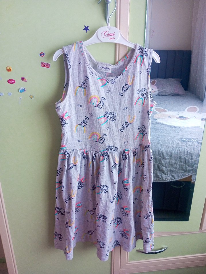 Kolsuz, bol kesim ve pileli etekli kız çocuk elbisesi. Pamuklu kumaş üzerinde renkli batik desenleriyle gri renktedir. 9-10 yaşa uygundur