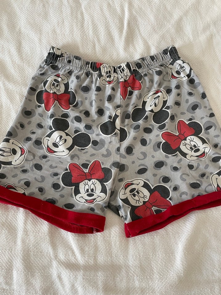 Gri pamuklu, bol kesim, Mickey ve Minnie baskılı kız çocuk şortu, düğmeli ve kırmızı detaylı. Rahat sokak stili şort.