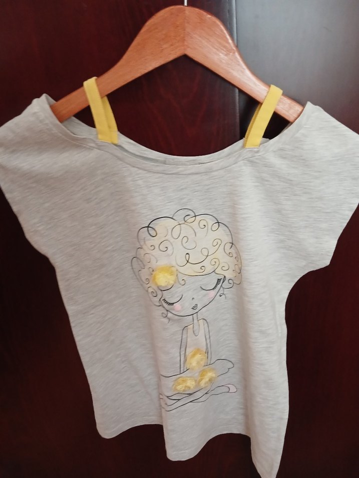 Kız çocukları için gri pamuklu tişört, bol kesim, kısa kollu ve yuvarlak yakalıdır. Sarı askılı, baskılı ve düğmeli tasarımıyla sokak stiline uygundur.