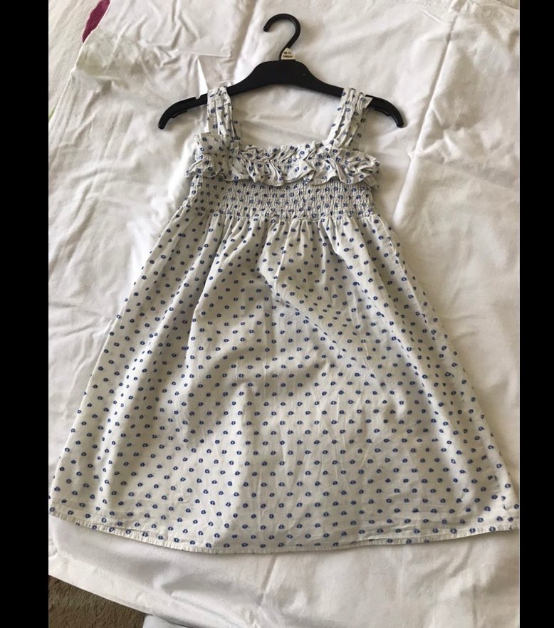 Pamuklu, kolsuz ve bol kesimli kız çocuk elbisesi, fırfır detaylı ve askısız yakaya sahip. Gri tie-dye deseni ve bohem tarzda.