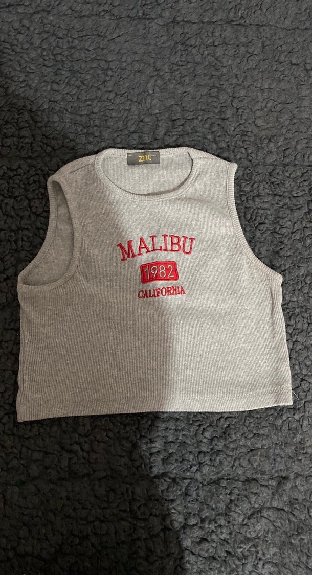 Pamuklu, örme kumaştan yapılmış, gri renkli, fitted kesim kız çocuk atlet. Bisiklet yaka ve "MALIBU 1982 CALIFORNIA" baskılıdır. Trend sokak stili için uygundur.