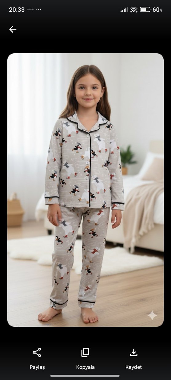 Pamuklu kumaştan yapılmış, uzun kollu ve düğmeli kız çocuk pijama takımı. Gri renkte, baskılı desene sahip ve notched lapel yakalıdır. ️