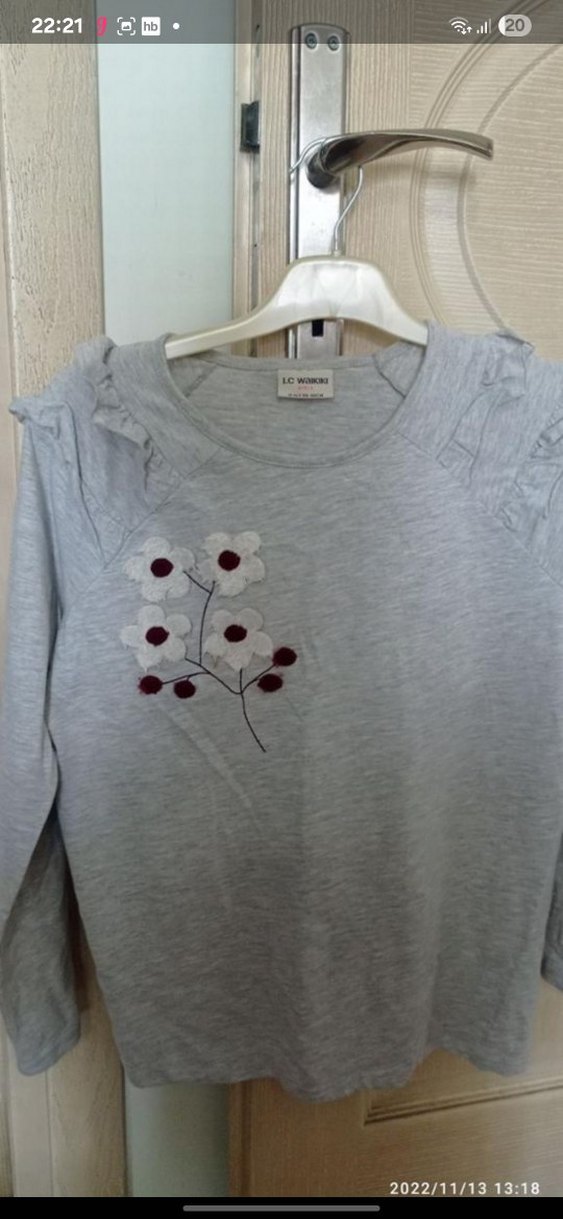 Pamuklu, yuvarlak yakalı, uzun kollu ve bol kesim kız çocuk tişörtü. Çiçek desenli baskı ve düğmeli detaylar içerir.
