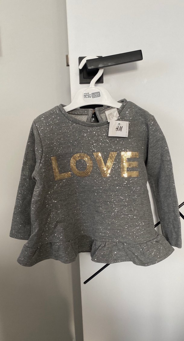 Gri renkli, uzun kollu kız çocuk sweatshirtü. Parlak detaylı, "LOVE" baskılı ve volanlı etek ucu ile salaş kesim.