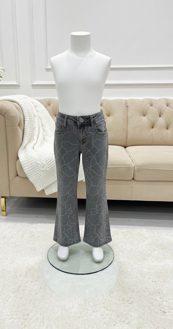 Kız çocukları için gri renkli, regular fit kesim, payet işlemeli ve batik desenli denim pantolon.