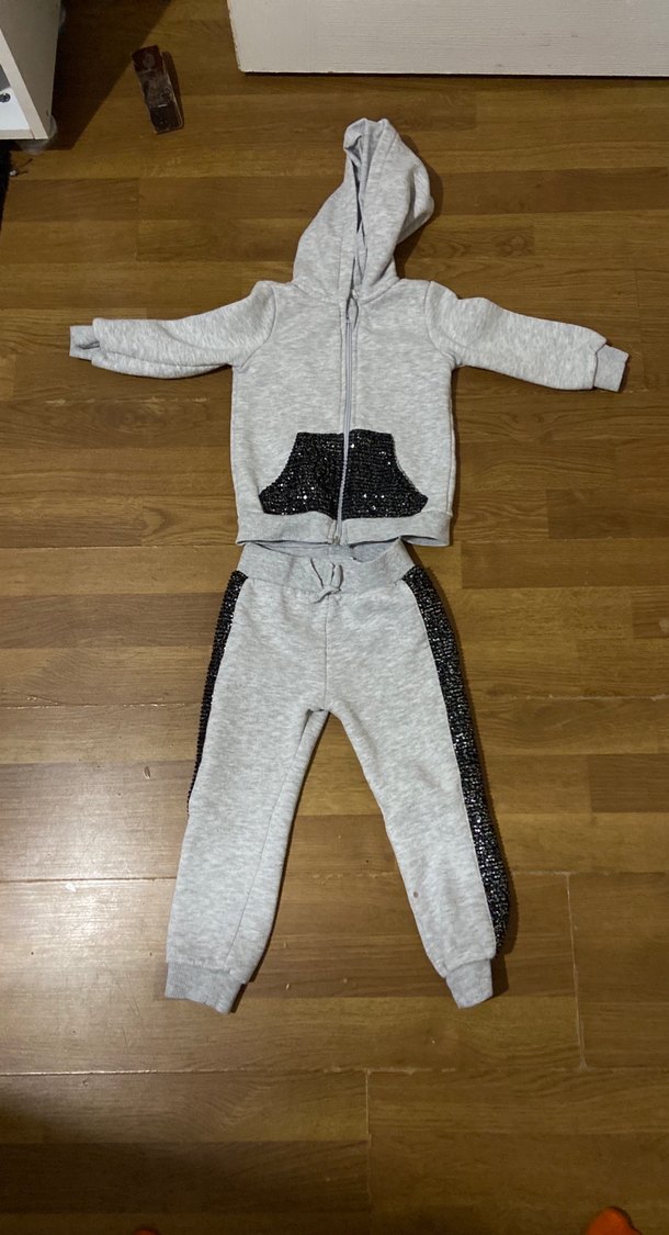 Kız çocukları için gri, yumuşak kumaştan, payet detaylı, kapüşonlu ve uzun kollu eşofman takımı. Sokak tarzına uygun rahat kesim.