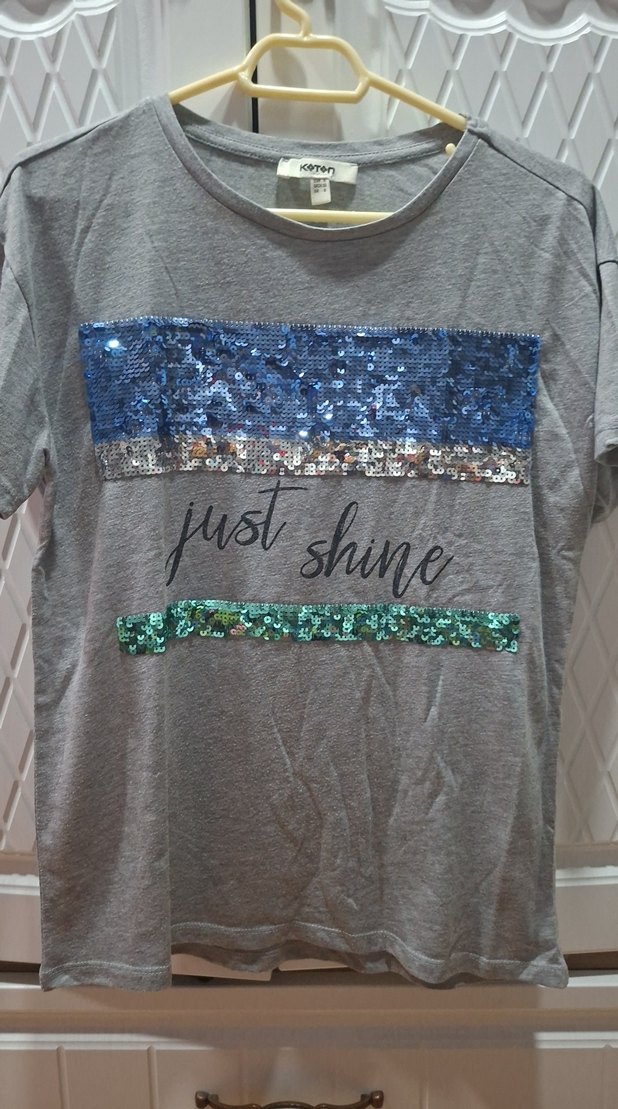 Gri renk, kısa kollu, yuvarlak yakalı, bol kesim kız çocuk tişörtü. Payetli renkli çizgiler ve 'just shine' yazısı bulunur. ✨