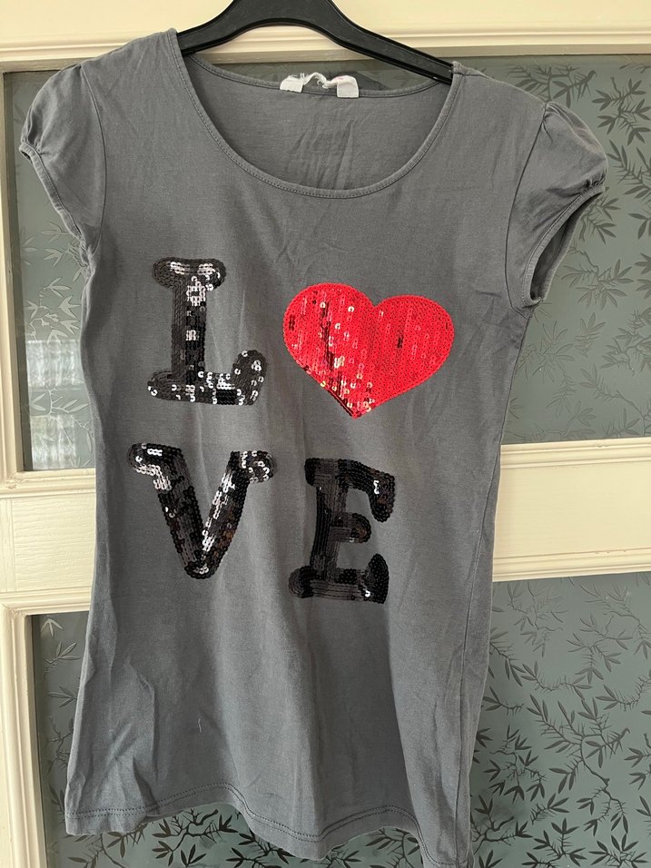 Gri renkte, kısa kollu, yuvarlak yakalı kız çocuk tişörtü. Payetli 'LOVE' baskılı.