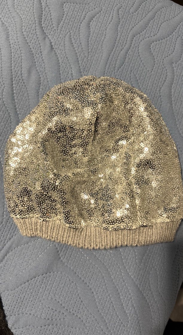 Çocuk için gri renkte, yumuşak örgü kumaştan yapılmış ve parlak payetlerle süslenmiş bere. Rahatlığı ve trendi bir arada sunar. ✨