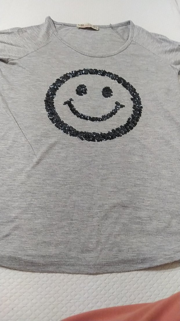 Kız çocukları için gri tişört, yuvarlak yaka ve kısa kolludur. Rahatlığı sağlayan bol kesim ve siyah payetli gülen yüz baskısı bulunur.