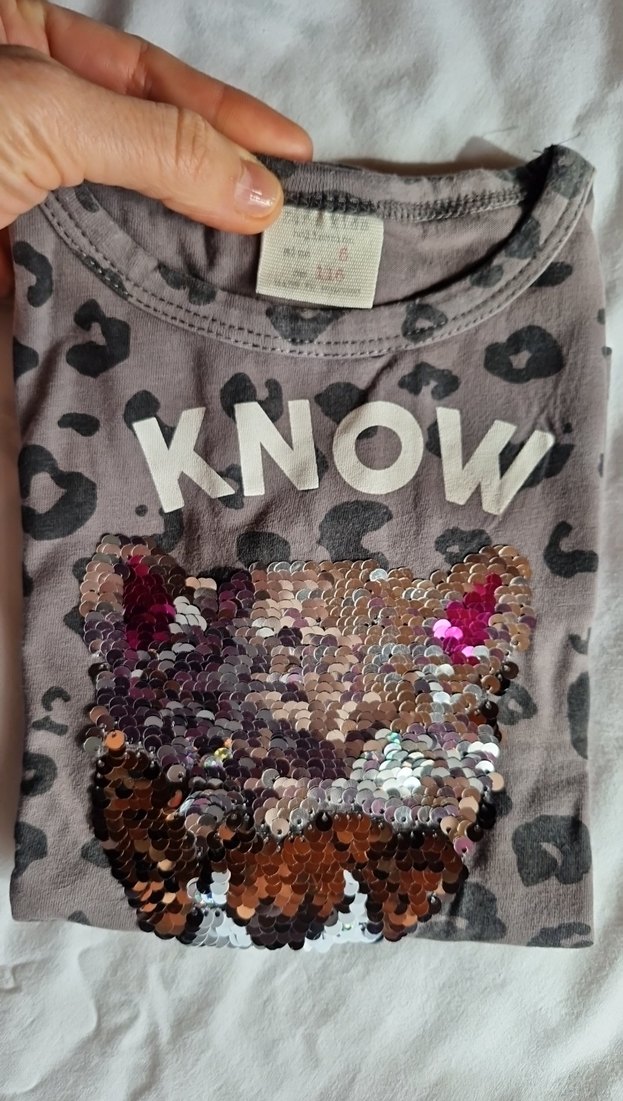 Deformasyon yoktur tertemizdir renkli, bol kesim, uzun kollu tişört. Leopar desenli ve payetlerle süslenmiş kedi figürlü, yuvarlak yaka ve "KNOW" yazılı.