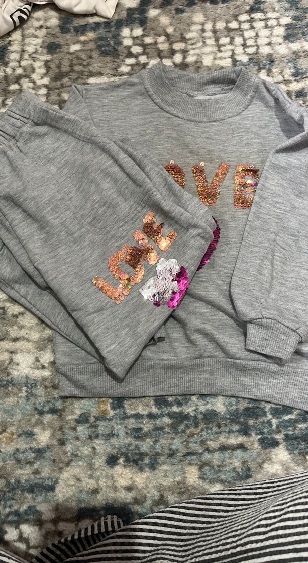 Gri renkli kız çocuk sweatshirtü, uzun kollu ve yuvarlak yakalıdır. Rahat kesimi ve payet işlemeli 'LOVE' deseniyle trend bir görünüm sunar.