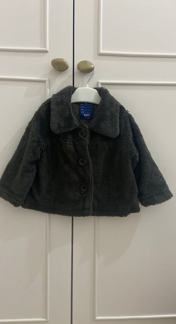 Kız çocuk gri peluş kumaştan, kürk detaylı, kesimli yakalı ve bol kesim ceket. Desensiz, sade tasarıma sahiptir. Kendinden simli deşene sahiptir 9-12 ay