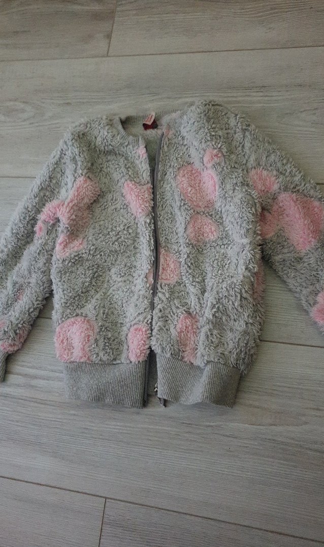 Gri ve pembe tonlarda bağlama desenli, peluş detaylı, bol kesim, bisiklet yaka kız çocuk ceketi.