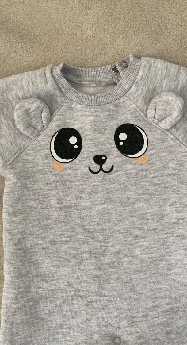 Gri renkli, yuvarlak yaka ve uzun kollu, bol kesim sweatshirt. Sevimli baskılı yüz ve kulaklarda peluş detaylar bulunur.