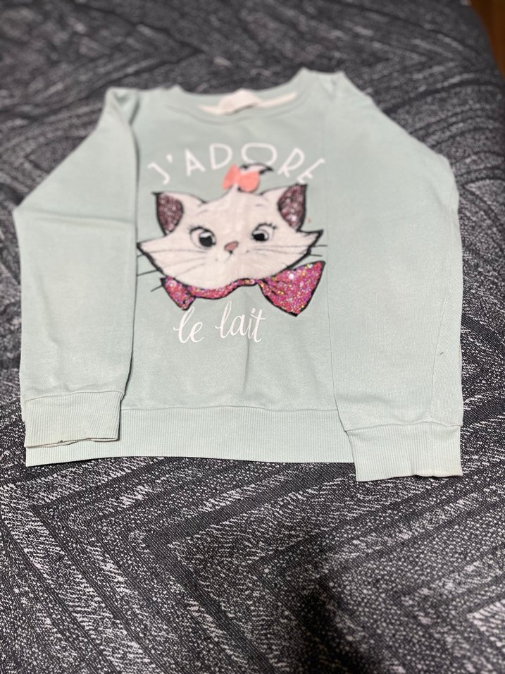 Pamuklu, uzun kollu, yuvarlak yakalı, bol kesim gri sweatshirt. Üzerinde peluş detaylı baskılı kedi ve 'J'ADOR le lait' yazısı bulunur. Trend sokak stili için uygundur.