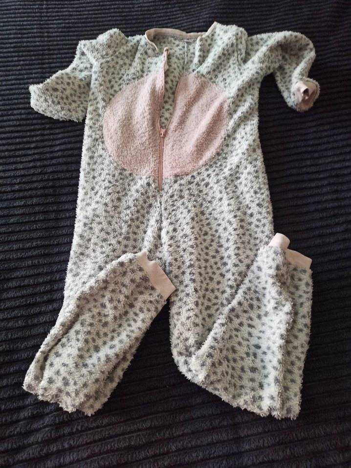 Kız çocuk gri peluş tulum pijama, uzun kollu ve V yaka detaylıdır. Yumuşak kürk detaylı kumaşıyla rahatlık sağlar. az kullanılmış, hafif tiftiklenme mevcut, o nedenle fiyatı uygun tutuldu