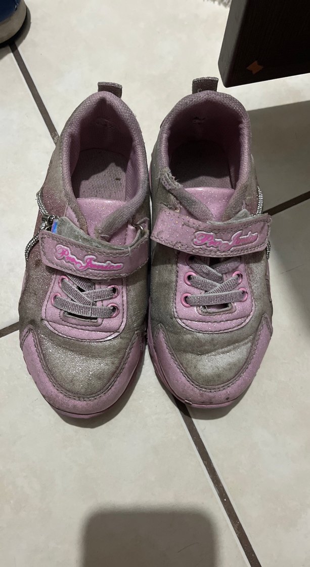 Pembe ve gri renkte, cırtcırtlı kapamalı kız çocuk spor ayakkabısı. Kauçuk tabanlı, sokak stili için uygun.