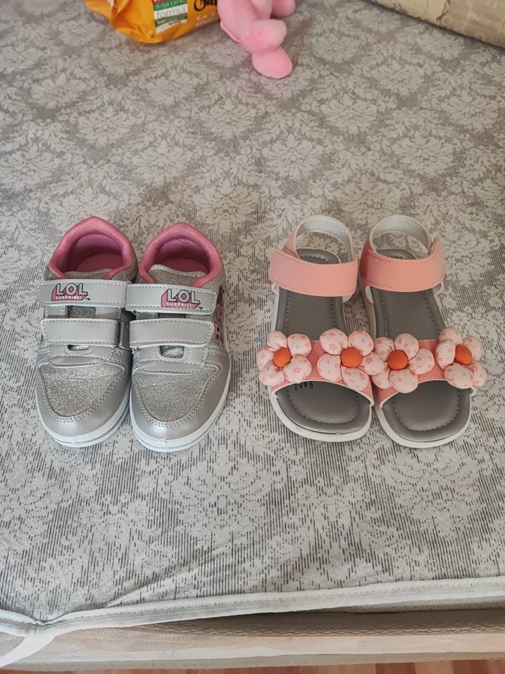 Gri ve pembe renklerde, cırt cırtlı kız çocuk terlik ve sandalet. Terliklerde nakış detayları, sandaletlerde çiçek süslemeleri bulunur. Kauçuk malzemeden üretilmiştir. "LOL" yazısı yer alır.
