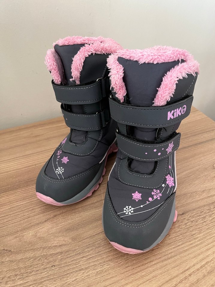 Kaydırmaz tabanlı kız çocuk botu, baskılı ve cırt cırtlı. Pembe yumuşak astar rahatlık ve sıcaklık sağlar. Gri-pembe renkleriyle trend sokak stiline uygun. "KiKE" markalı.