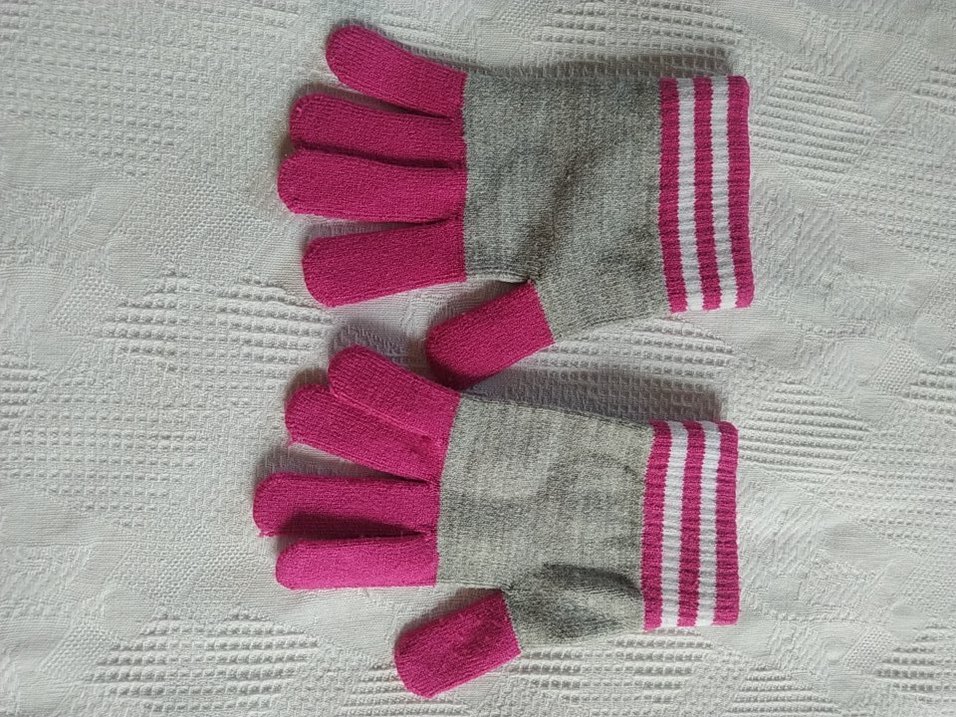 Kız çocukları için örgü tasarımlı, yumuşak ve sıcak fleece malzemeden yapılmış gri-pembe eldivenler. Düz ve sade stilde, çizgili manşetlere sahiptir.