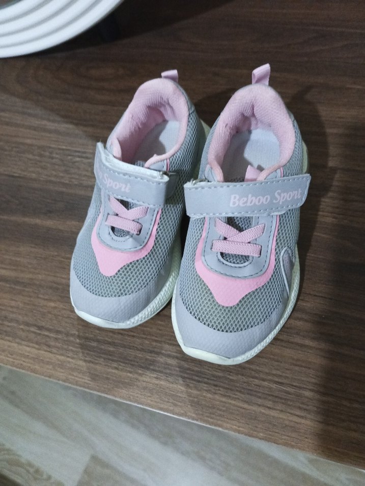 Kız çocukları için gri ve pembe renklerde baskılı spor ayakkabılar. Kauçuk tabanlı ve kolay giyilen cırt cırtlı kapanışa sahiptir.
