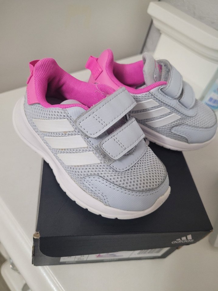 Gri ve pembe renklerde, baskılı detaylı, kauçuk tabanlı ve cırt cırtlı kız çocuk spor ayakkabısı, sokak stiline uygun.