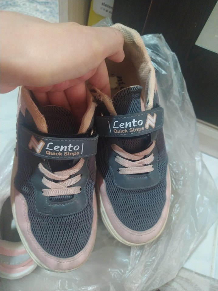 Gri ve pembe renklerde, baskılı detaylı, lastik tabanlı ve kolay giyilen velcro bantlı kız çocuk spor ayakkabısı. Marka adı 'Lento' bantta görülebilir.