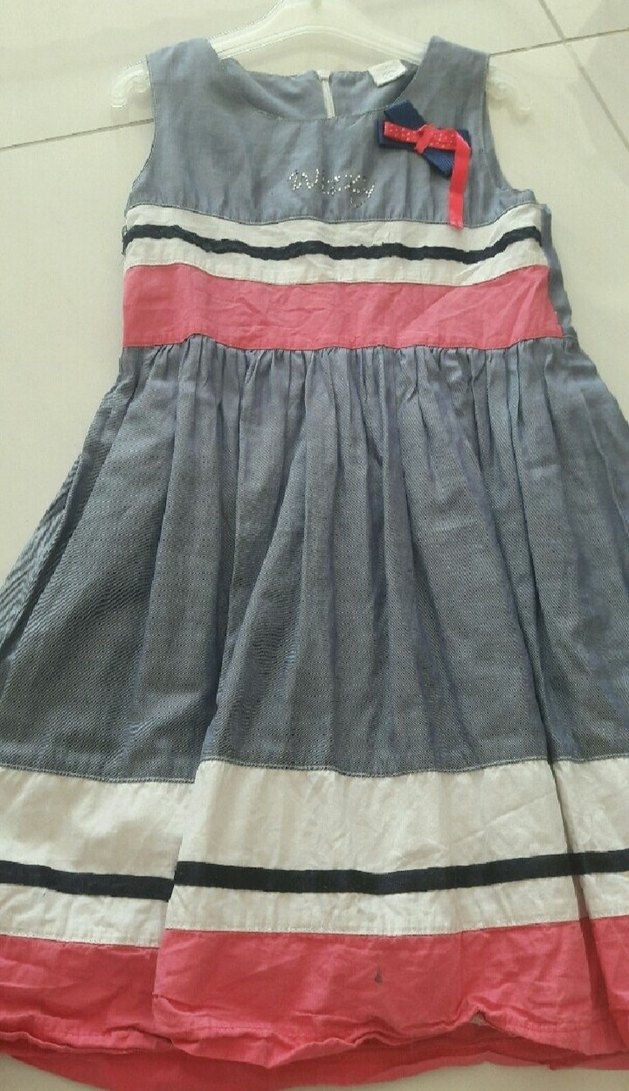 Gri, beyaz ve pembe renklerde, piliseli ve nakışlı desenlere sahip kolsuz, straplez yaka bohem tarzda kız çocuk elbisesi.