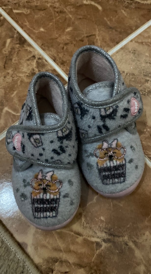 Gri polar kumaştan yapılmış, üzerinde nakış desenler bulunan ve cırt cırtlı bant ile kolay giyilen kız çocuk ev terliği.