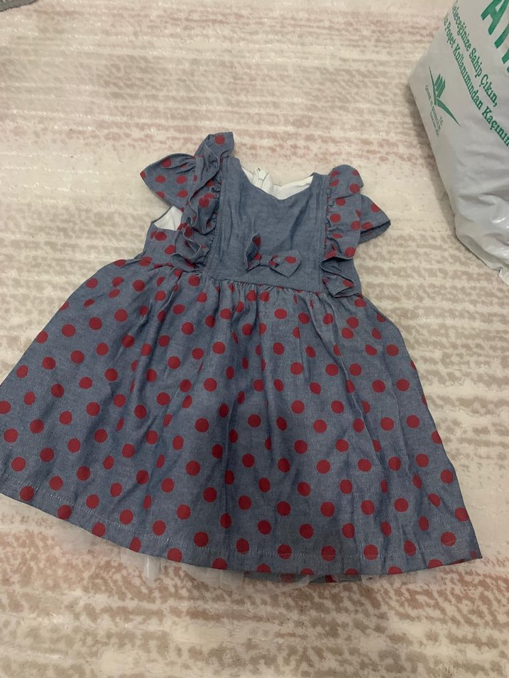 Gri sentetik kumaştan, kırmızı puantiyeli ve fırfırlı kollu, straplez yaka bohem tarzda kız çocuk elbisesi.