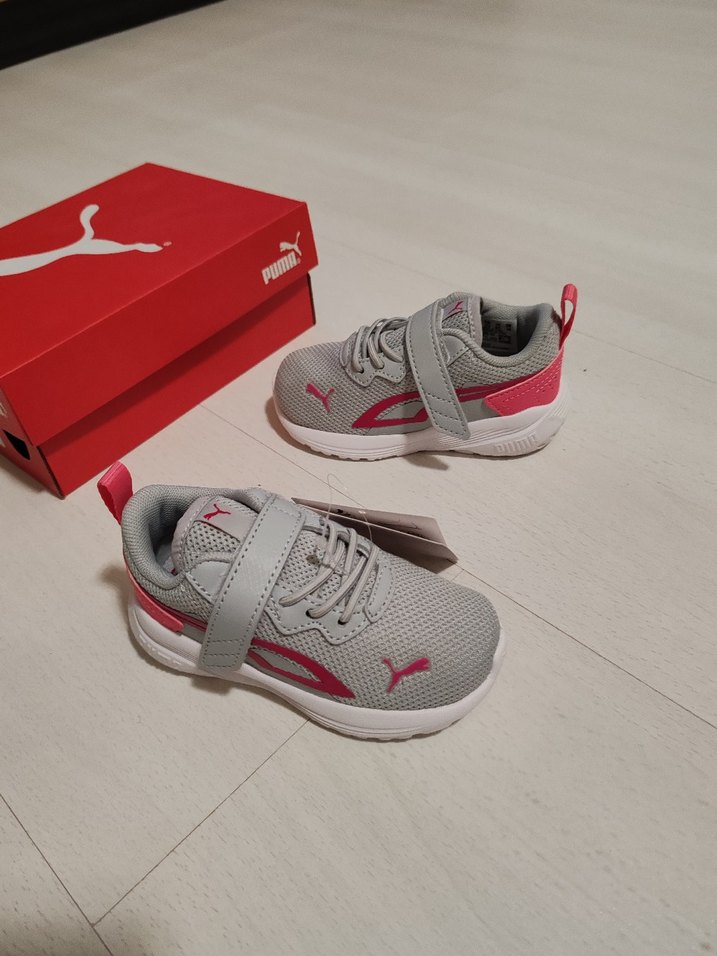 Kız çocukları için gri Puma spor ayakkabılar, Velcro bantlı ve baskılı desenli, kauçuk tabanlı, trend sokak tarzı ayakkabılar.