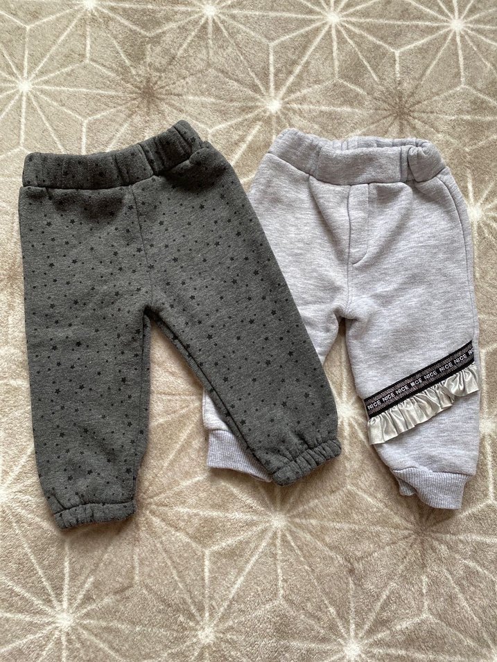 Gri tonlarında, bol kesim ve örgü detaylı iki adet kız çocuk eşofman altı. Biri hafif yıldız desenli, diğeri şerit ve fırfır süslemeli. Rahat ve günlük kullanım için.