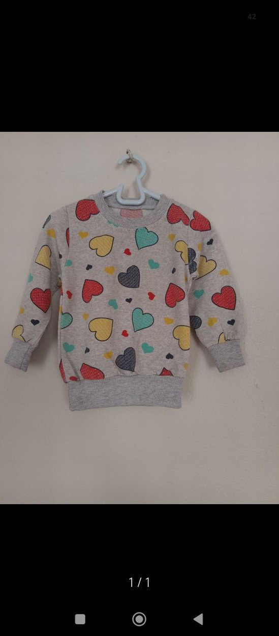 Uzun kollu, yuvarlak yaka, bol kesim kız çocuk sweatshirtü. Yumuşak ve örme dokulu kumaştan, gri zemin üzerine renkli kalp baskılıdır.