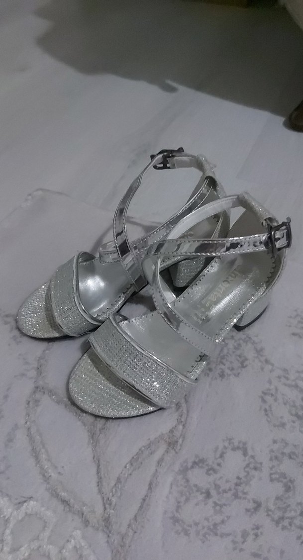 Kemerli kayışa ve gri sim deseni detayına sahip kız çocuk özel gün ayakkabısı. Beyaz ve gri tonları klasik bir şıklık sunar.