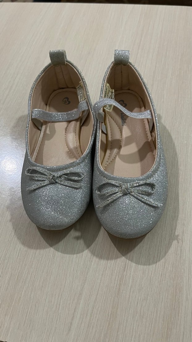 Kız çocukları için gri simli babet ayakkabılar, önünde küçük fiyonk detayıyla. Kauçuk malzemeden yapılmış, modern klasik tarzda. ✨