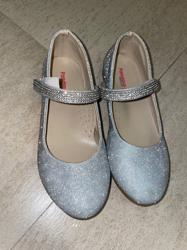Gri simli yüzeye ve ışıltılı bant detayına sahip kız çocuk babet ayakkabı. Kauçuk tabanlı, klasik şıklık ve sokak modası tarzını birleştirir. Sadece 1 kez düğünde giyildi. Temiz sorunsuz