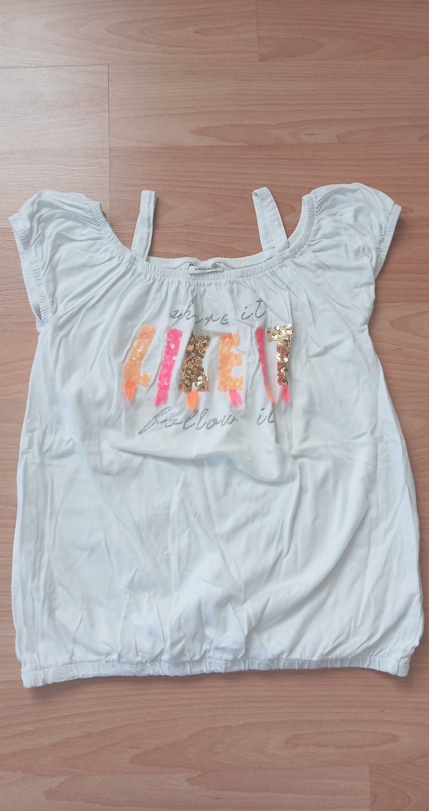 Kız çocukları için pastel gri renkte, simli baskılı, straplez ve kolsuz, bol kesim tişört. Trendy stili için idealdir.✨dolabımdan beğendiğiniz ürünle birleştirip alabilirsiniz