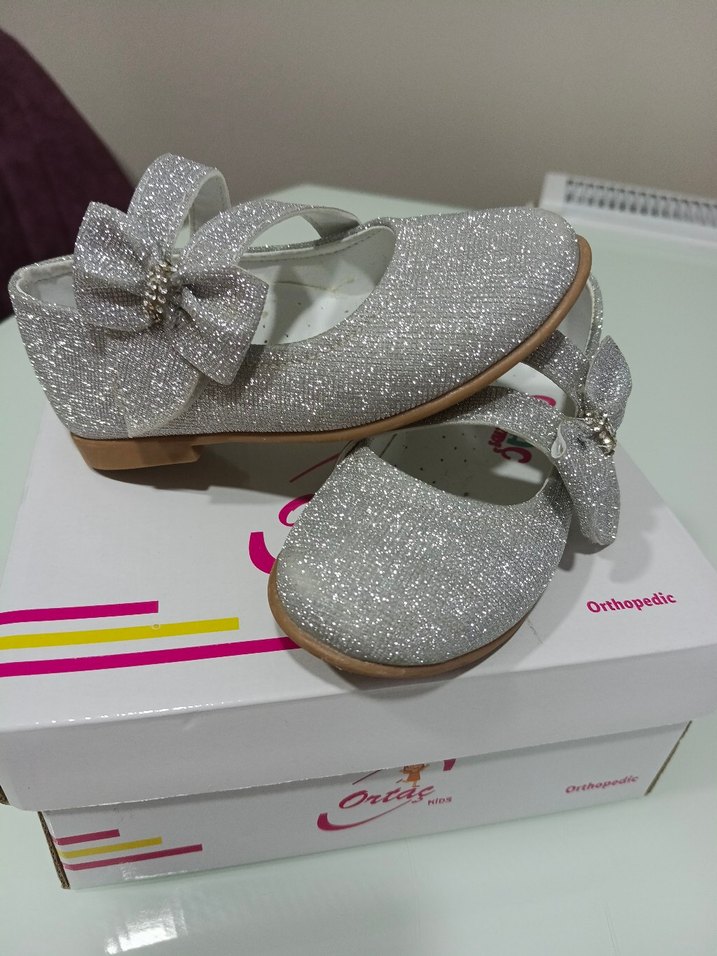 Gri renkli, fiyonklu kız çocuk babetleri, rahat kauçuk tabanlıdır. Ortopedik özelliği bulunur.